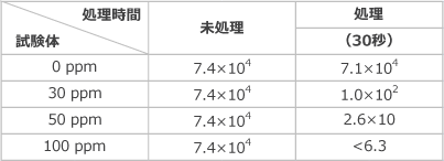 ※衛化第31号厚生省生活衛生局食品化学課長通知「いわゆる電解水の取扱いについて」内の規定に適合 活性電解次亜水の除菌力 一般細菌類に対しての殺菌効果試験 結果